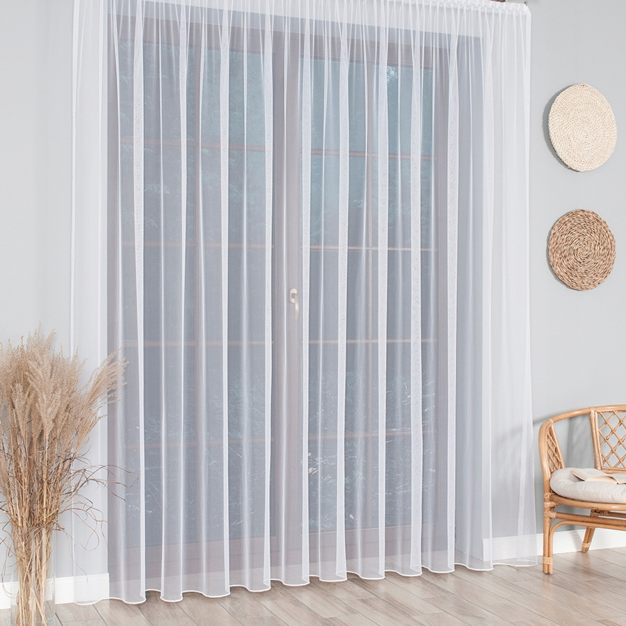 - po maksymalnym zmarszczeniu wszytej taśmy firana ma szerokość połowę mniejszą (granica błędu +/-3cm)